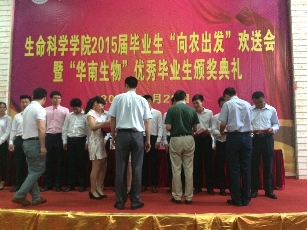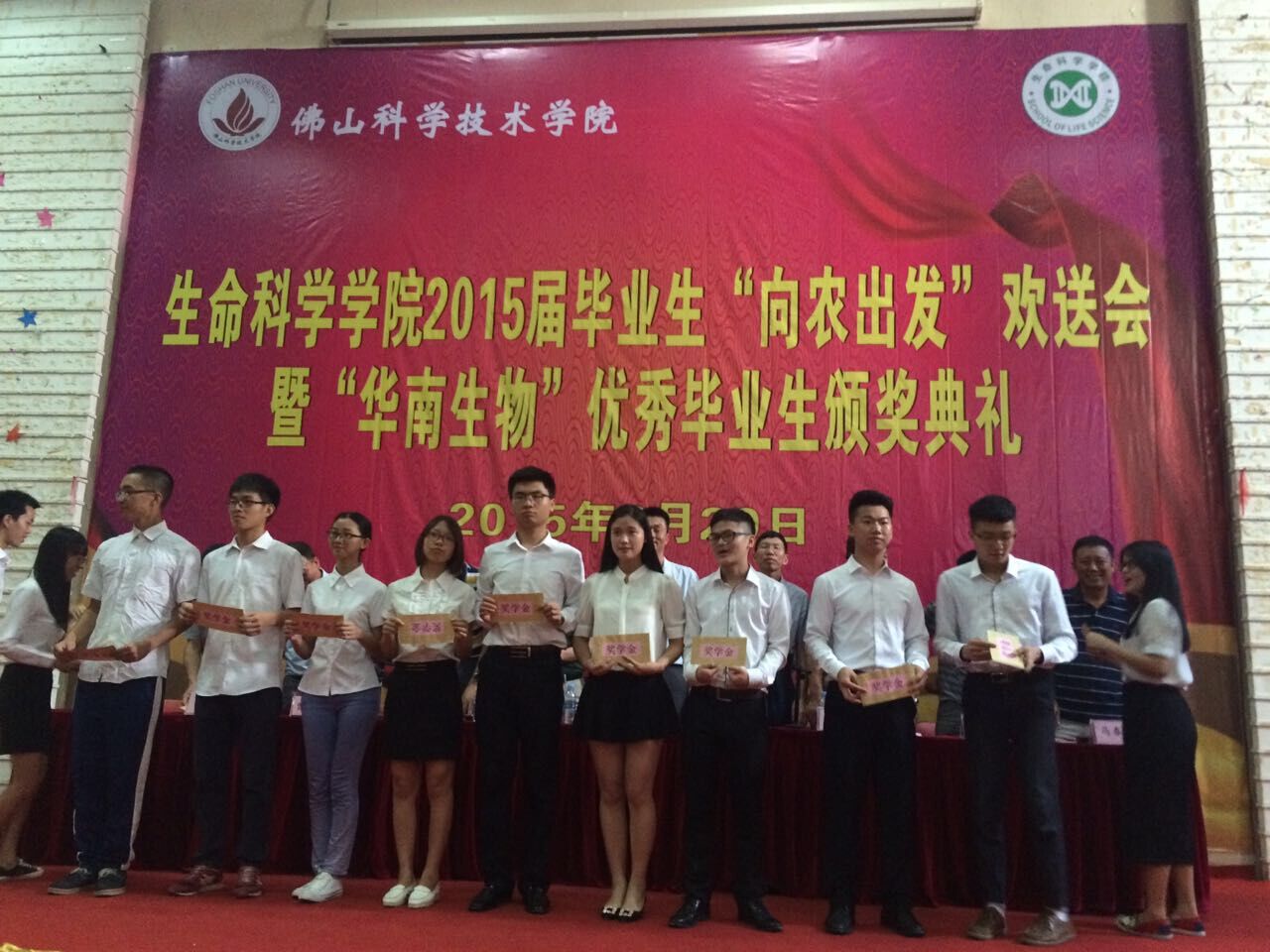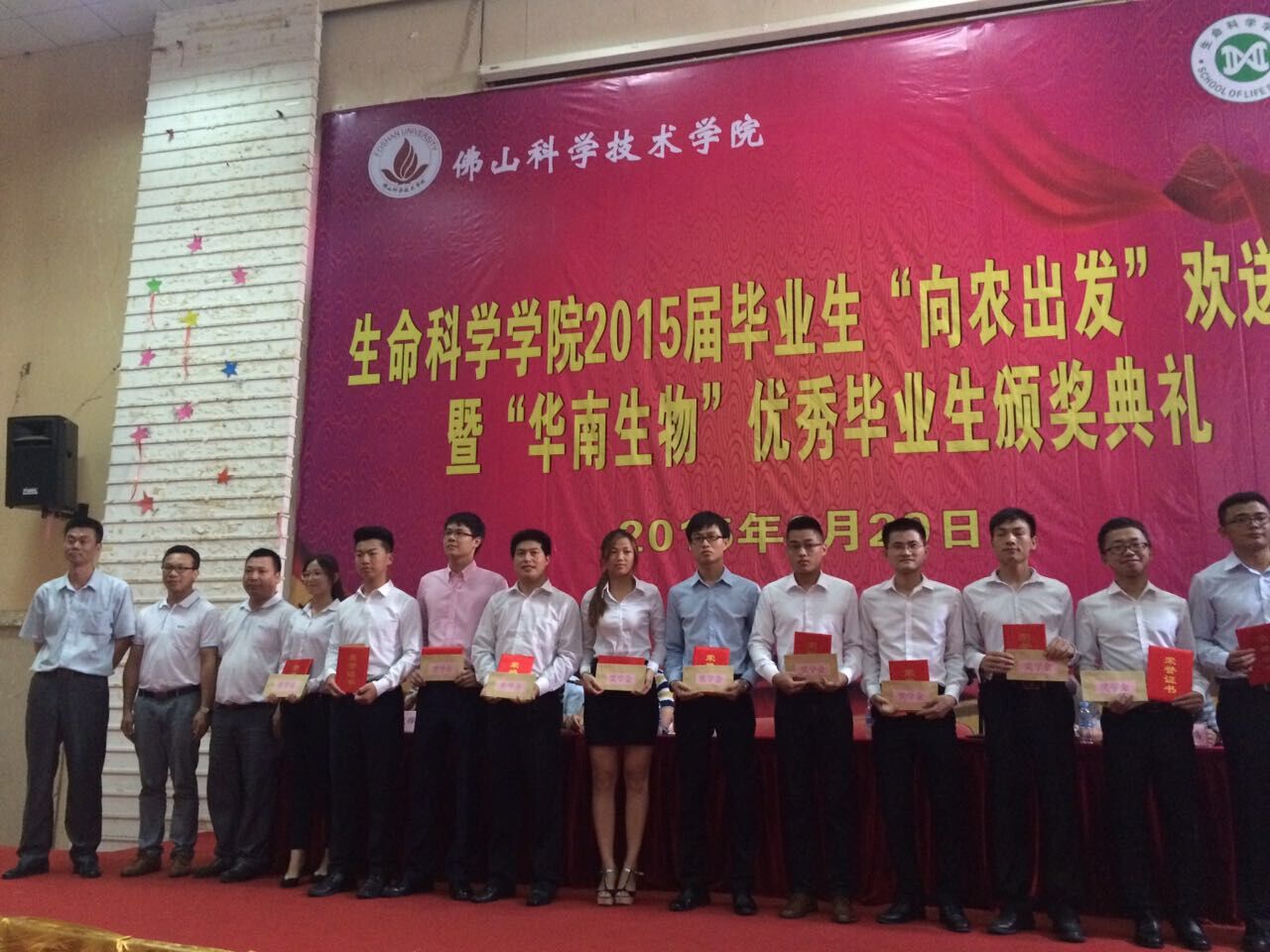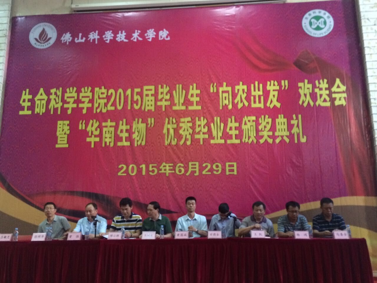 2015629日下午佛山科學技術學院生命科學學院2015屆畢業生“向農出發”歡送會暨“華南生物”優秀畢業生頒獎典禮在北院圖書館一樓報告廳舉行。佛山科學技術學院生命科學學院院長王炳云、書記甘蔭全等學院領導、廣州市華南農大生物藥品有限公司副總經理黃國城、班主任、嘉賓、全體畢業生出席并參加了畢業生頒獎典禮。