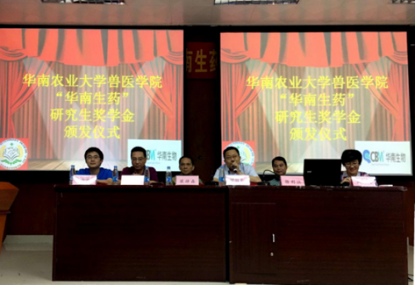 2017年5月24日上午,廣州市華南農(nóng)大生物藥品有限公司(下稱“華南生物”)在廣州華南農(nóng)業(yè)大學(xué)獸醫(yī)學(xué)院開展了2017年“華南生藥”研究生獎學(xué)金頒獎典禮,同時進(jìn)行了“創(chuàng)新中的華南生物及就業(yè)指導(dǎo)”課程分享。