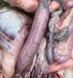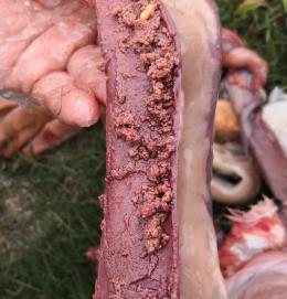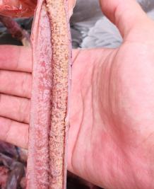 現場剖檢4只鵝,4/4只鵝出現腸粘膜脫漏、腸道充滿血樣液體、空腸回腸出現蠟樣栓塞;4/4只鵝出現胰腺有壞死點;4/4只鵝腎腫脹;呼吸道癥狀不明顯,如下圖: