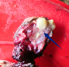 臉部皮下水腫,鼻腔粘膜充血腫脹、鼻腔內(nèi)有黃白色干咯樣物;喉頭氣管有粘液,喉頭氣管上部出血。
