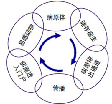 病原微生物必須有足夠數(shù)量與易感宿主家禽接觸,才能使該病原引起的疾病在易感家禽間擴(kuò)散。為了感染家禽,病原微生物必須與動(dòng)物有足夠的接觸(傳染壓力)。同時(shí),病原體必須能具有傳染性才能可通過(guò)直接接觸(雞與雞)和/或間接接觸(經(jīng)由污染的設(shè)備、環(huán)境等)和/或通過(guò)攜帶者進(jìn)行傳播。蟲(chóng)類(lèi)、鳥(niǎo)類(lèi)、其他動(dòng)物或一些有機(jī)物可作為某些病原的儲(chǔ)存宿主(例如飼料和糞水),使病原持續(xù)存在。對(duì)傳染鏈(圖1)的一個(gè)或幾個(gè)環(huán)節(jié)有實(shí)質(zhì)性影響的行為都會(huì)降低疾病傳播的風(fēng)險(xiǎn)。