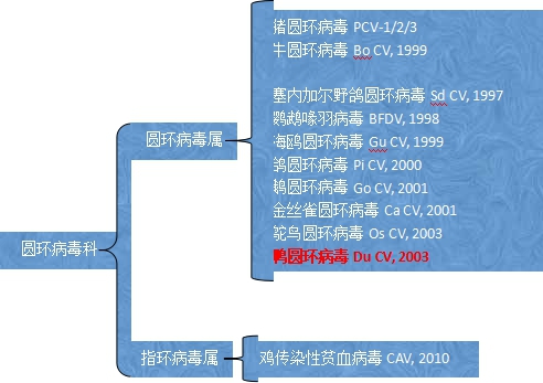 最早在2002年,德國科學家Hattermann 發現勃蘭登堡某養鴨場的法國番鴨表現出羽毛凌亂、生長遲緩、體重減輕等癥狀,認為這與其他禽類感染圓環病毒后的臨床特點很相似,于是對樣品進行負染電鏡(EM)檢測發現,法氏囊中存在無囊膜的球狀病毒,直徑大約為 15~16nm。最終根據圓環病毒rep基因的鑒定,發現與其他圓環病毒同源性僅39%~60%,與鵝圓環病毒同源性最高,但也僅為82%。推斷新發現的可能為新的圓環病毒,鴨圓環病毒DuCV。
