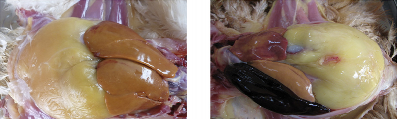 5、禽弧菌性肝炎:肝臟腫大,慢性病例在肝臟的表面和實質內有黃色、星芒狀的小壞死灶或布滿菜花狀的大壞死區,急性病例肝臟被膜脫落肝臟出血,腹腔內有多量血水。