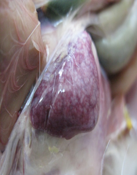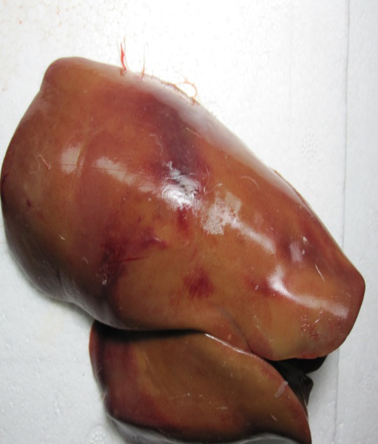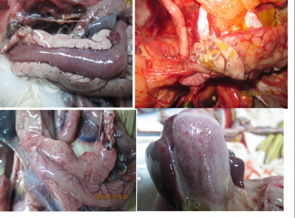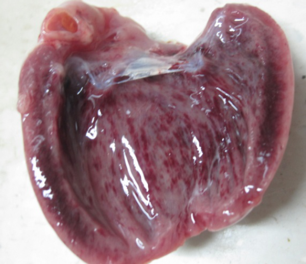心內(nèi)外膜出血;腦膜水腫、出血;肺臟先是一側(cè)出血發(fā)黑,后兩側(cè)出血發(fā)黑;肝臟腫大,顏色多數(shù)發(fā)黃發(fā)白,類似腺病毒;脾臟腫大、出血,似大理石樣花斑;腎臟腫大、出血,似花斑樣;有的腺胃乳頭出血;胰臟出血。