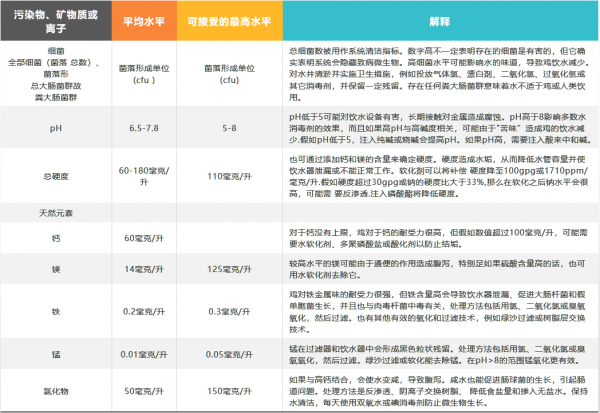 雞對(duì)水源中的礦物質(zhì)有較強(qiáng)的耐受力。但要注意微生物的生長(zhǎng),因?yàn)樵S多礦物質(zhì)也是微生物的營(yíng)養(yǎng)物。最好通過(guò)軟化的手段控制錳、硫磺、鈉、鎂離子的含量,也間接地防止水垢生成。