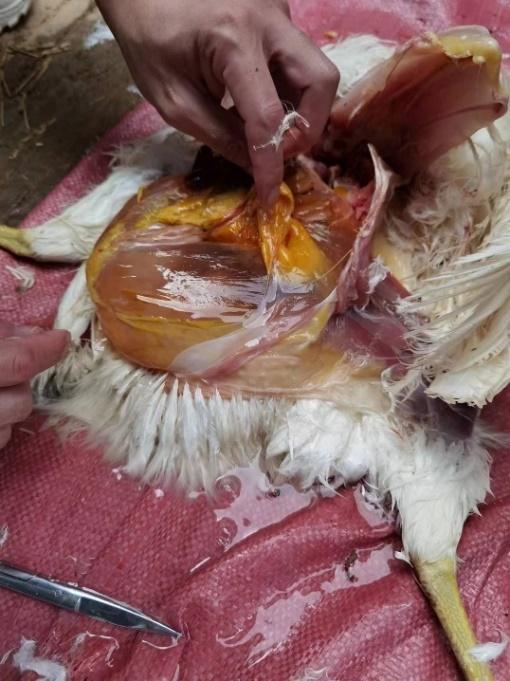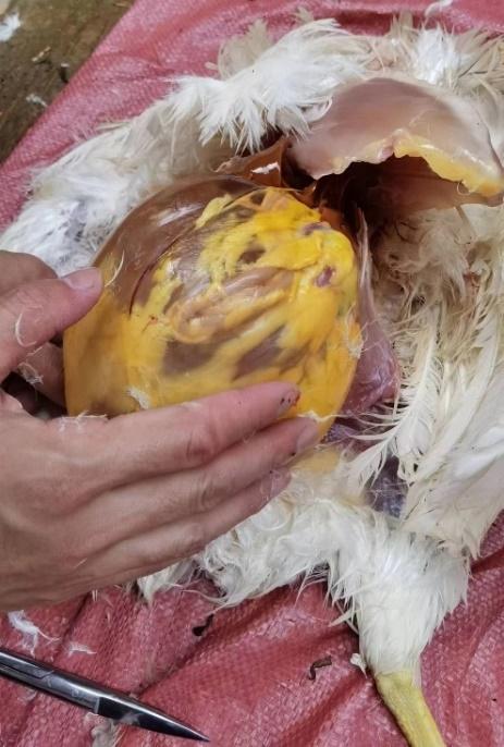 茂名某規(guī)模化蛋雞場飼養(yǎng)蛋雞3棟,單棟1.5萬只。A棟雞從開產(chǎn)到230日齡產(chǎn)蛋率一直上不去,維持在85%左右。大群采食量和飲水正常,平均每只雞采食量為105g,大群精神狀況良好,糞便正常。臨床觀察發(fā)現(xiàn)個別雞只(30只左右)腹部膨大下垂,觸之有波動感。頭頸高舉,行走時呈企鵝狀姿勢。B棟和C棟無此情況。